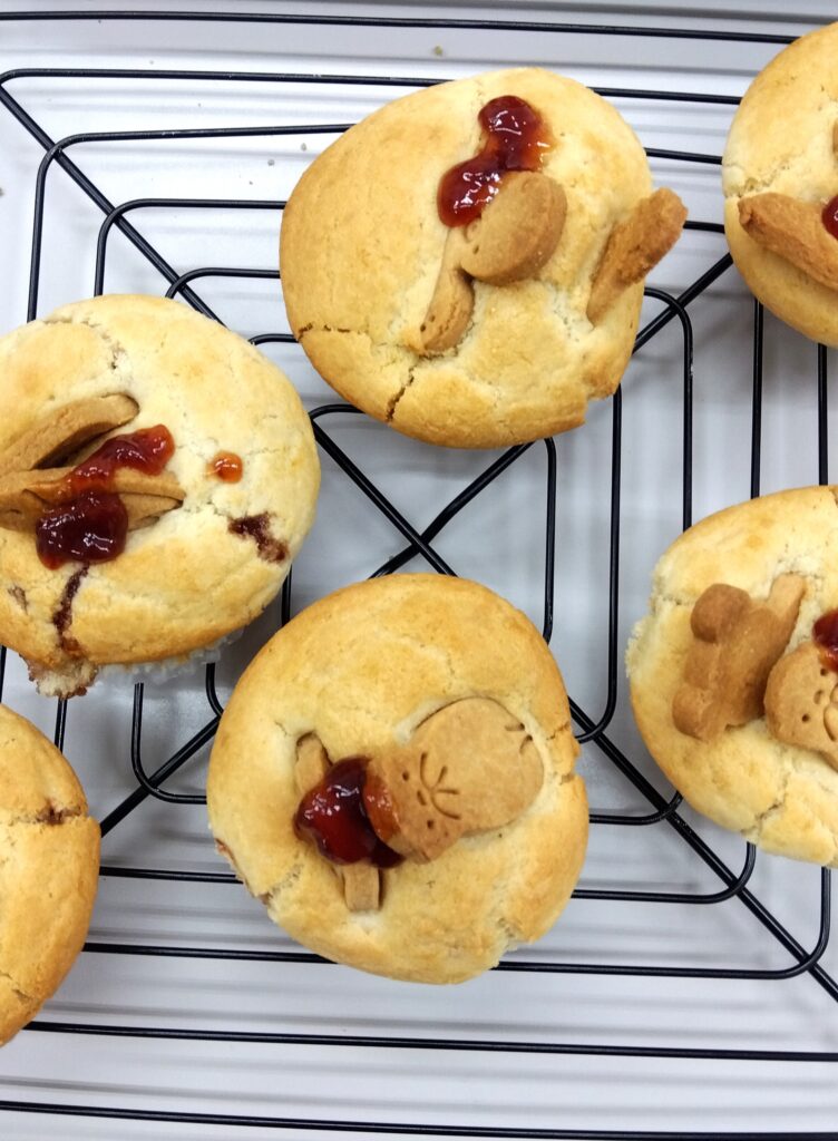 本日のお菓子はいちごジャム米粉マフィン、抹茶あんこ米粉マフィン、海の仲間たち米粉クッキー、森の仲間たち米粉クッキー、キャラメルナッツ米粉タルト、米粉ロシアンケーキのジャム乗せをしました。私は午前中いちごジャム米粉マフィンを作りました。前の日に粉の計量と液体を準備してくれているので、スムーズに作ることができました。