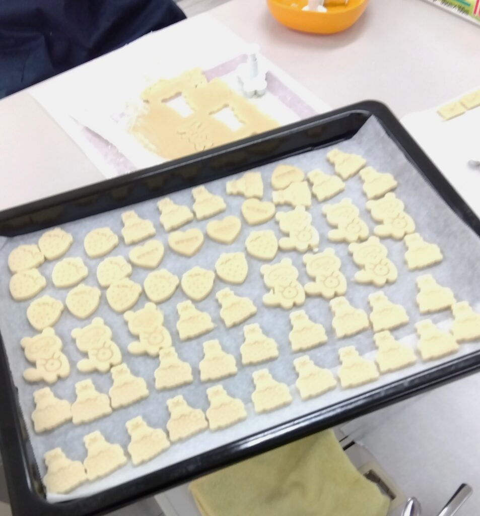 今日は、森の仲間たちクッキーを4人で作りました。動物や小物の型を入れるのが大変でした。スコッキー、森の仲間たちクッキー袋詰め、紙袋作りで糊と鋏を使いながら作りました!