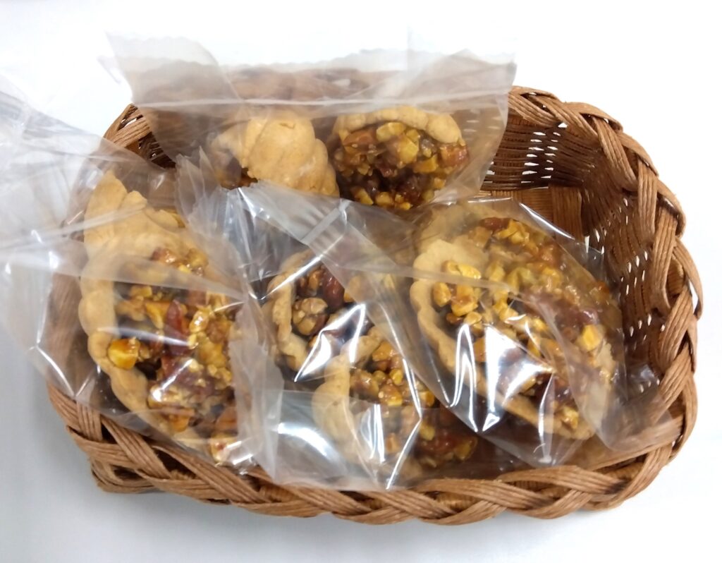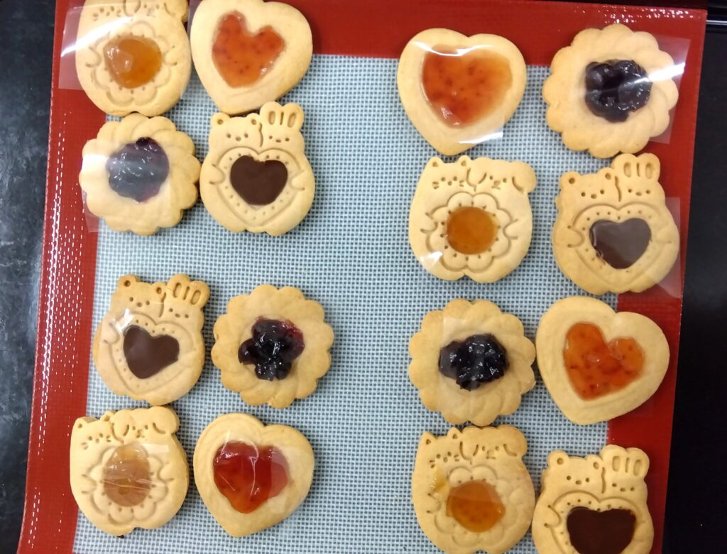 本日のお菓子は紅茶マーマレード米粉マフィン、海の仲間たちクッキー、森の仲間たち米粉クッキー、ロシアンケーキのジャム乗せを、キャラメルナッツ米粉タルトを作りました。